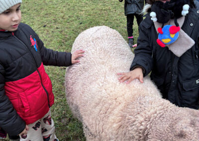 We visited the sheep in the field and looked at what they eat and what they provide for us. The hens and the cockerel were noisy and they were kept to provide eggs and chicken. In the cow shed we saw a bull and the cows were expecting calves.